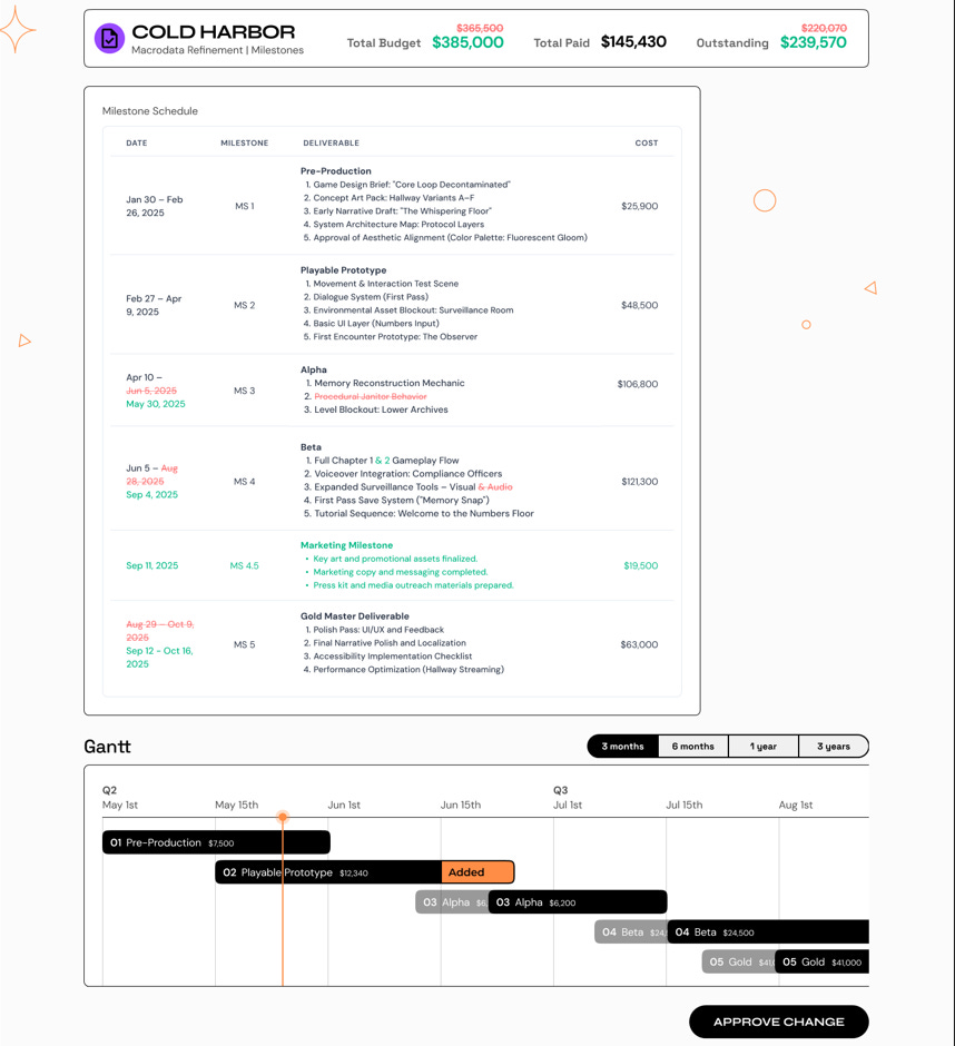 CLM exists to drive alignment through transparency. It helps us track the complexity inherent in game partnerships, requiring us to pay attention to every key milestone, every invoice, and how it tracks against the forecast. The CLM flags variances in budgets or delivery dates and pushes us to address them, all while keeping these things surfaced for all parties to see.