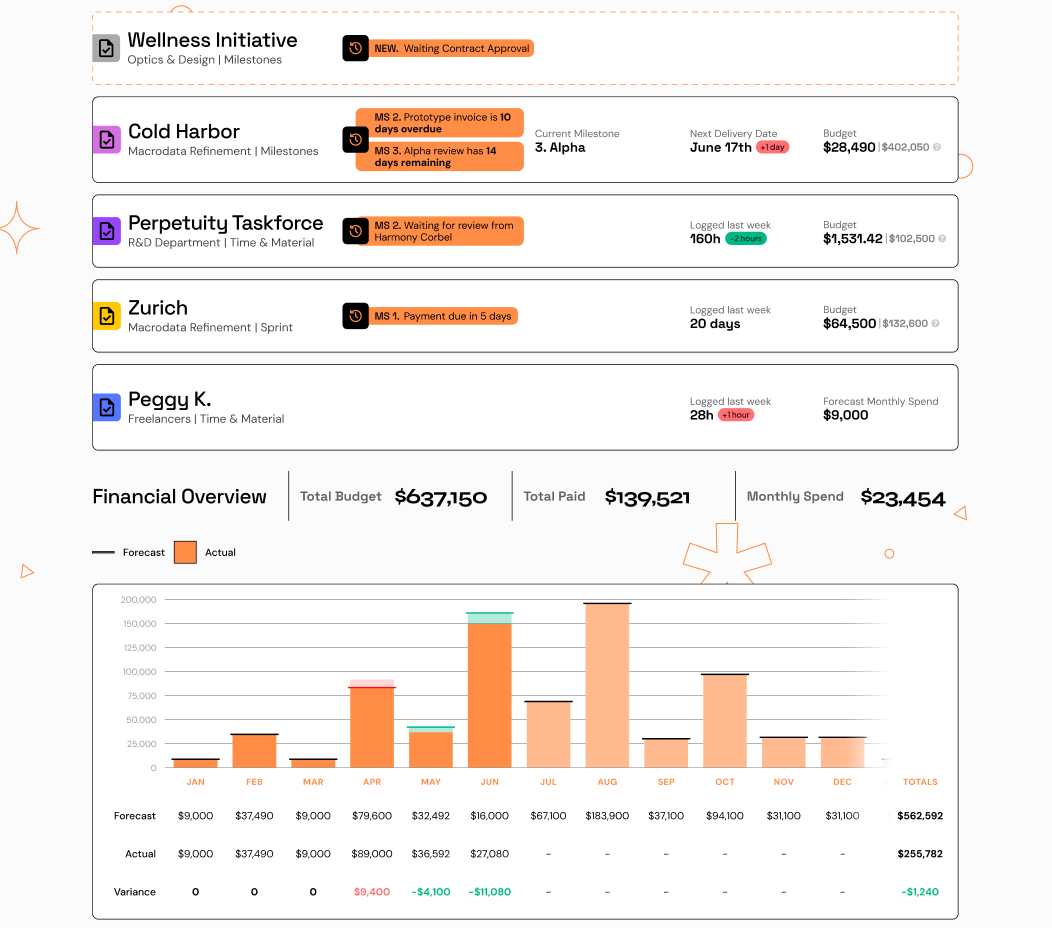 Project approvals: make it easy to determine when payments should be released, while surfacing misalignment early if a project is off target or budget.